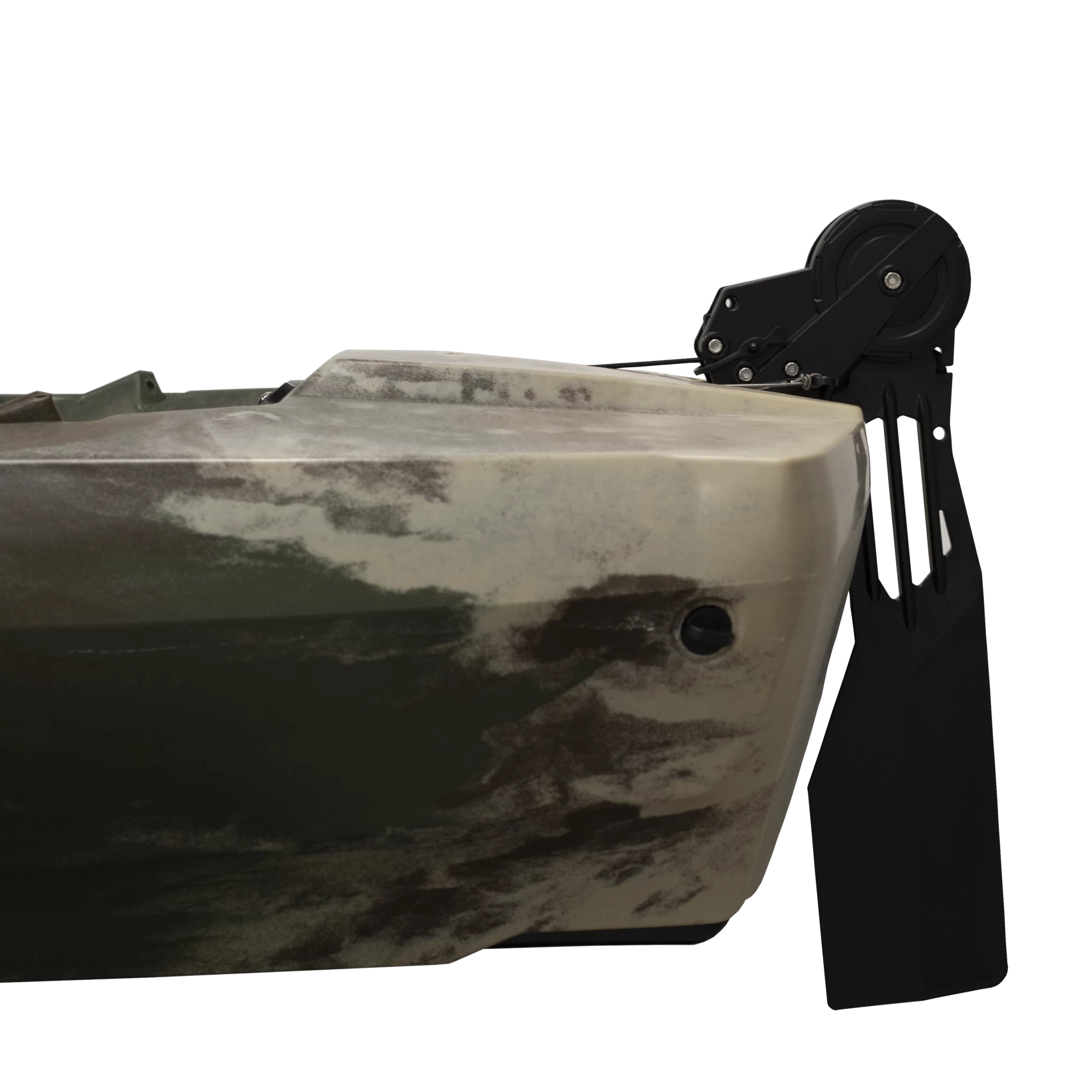 This rudder kit adds even more fishability to your SS107 or SS127! It utilizes the stock Double Acting™ Foot Braces featured on the Bonafide SS Series and offers hands free steering capabilities, as well as to help with tracking. The Steering Reel provides added on-the-fly adjustability for going from the low to high seat position. Designed to be ergonomic, the retractable lift/lower handles install on either side of the seat, allowing you to quickly deploy or stow your rudder. The super wide blade provides added surface area to make the rudder incredibly responsive, while the vents above the waterline reduce wind drag. Each of the components are 100% custom designed and made to maximize the performance of your SS07 or SS127. Features: Increases paddling efficiency and performance, Adjustable tension at the foot braces ” on the fly”, Low drag pulley for smooth deployment, Rubber bumpers to reduce noise during deployment, Tight turning radius for maximum performance, Rudder lock with hook tether to aid in transport, Includes all necessary components, Made in the USA.