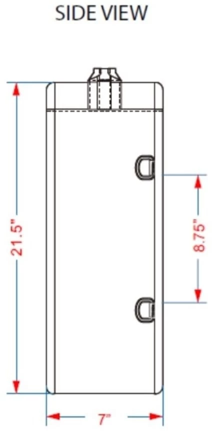 - External dimensions: 21.5 in. (length) x 8 in. (height) x 17.75 in. (width; 10 in. at small taper side)