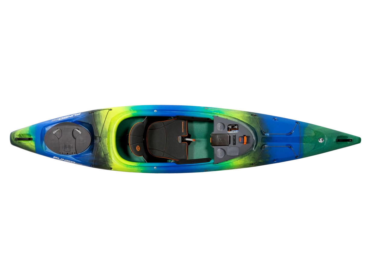 The patented Phase 3® AirPro seating system is the core of what makes Wilderness Systems the world’s most comfortable kayaks; the Pungo’s comfort and adjustability is built just for you, allowing you to be fully immersed in your on-water experience. The Pungo also integrates the most comprehensive kayak dashboard interface for optimal customization and features. It includes the removable DryTec dry box that allows you to take your valuables with you, two cup holders for your favorite beverage, a recess for the Wilderness Systems Lithium Battery (sold separately), SlideTrax ™ to hold mounts for phones, fishing rods and other accessories, and two mounting platforms for customized accessorizing. A protective and replaceable skid plate, comfortable rigid carry handles, industry-leading storage capabilities, and configurable deck bungee rigging rounds out a robust list of attributes.Â
