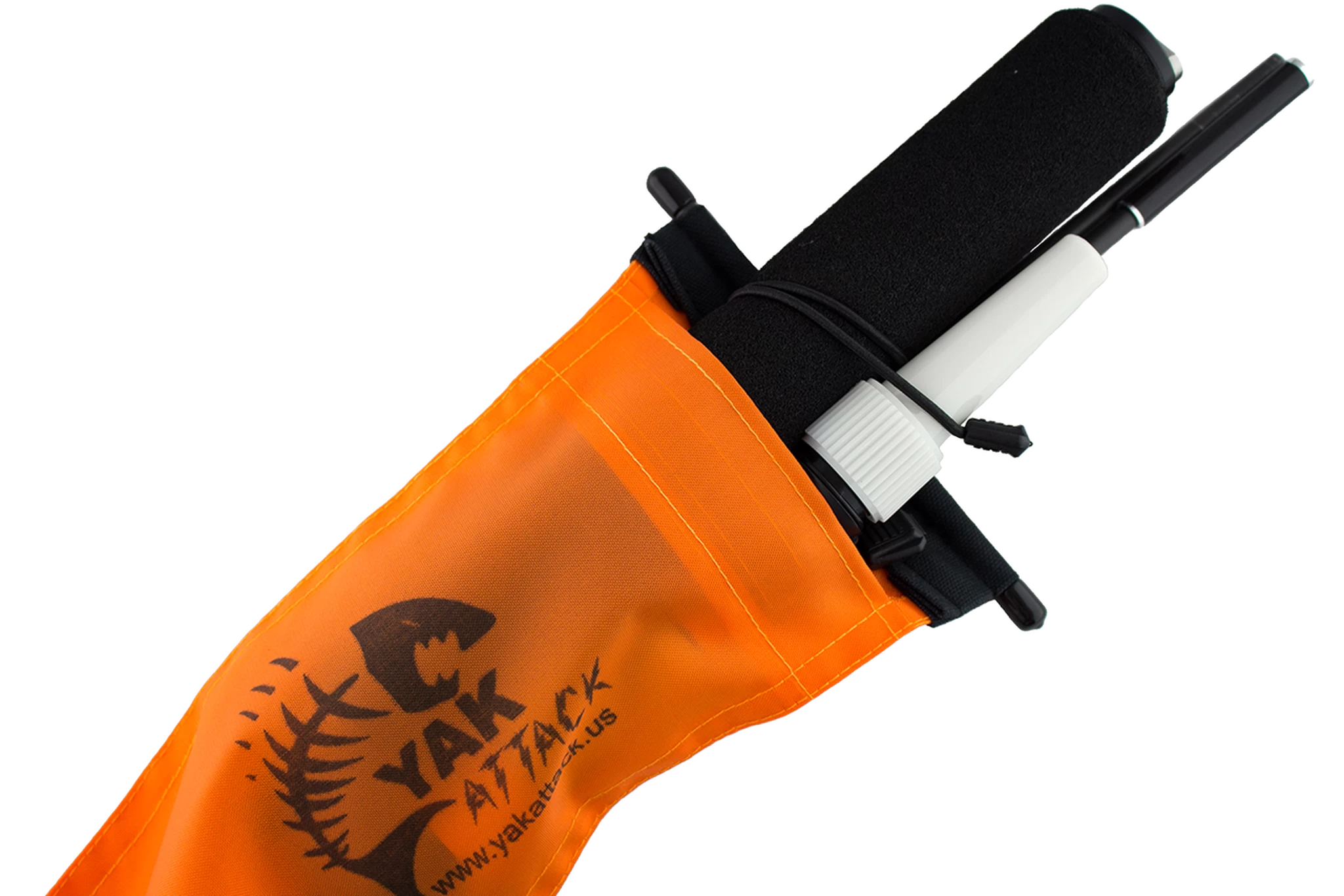 Atop this little dude sits a bright, twist-on illuminator that can be seen 360 degress up to 3 miles at night! (Clear visibility, of course..) The diffusive cover illuminates your cockpit so you can tie luers or prepare cheese and crackers with precision and accuracy. Reflective surfaces bounce back to optimize visibility. The bright orange flag is easily seen in daylight and doubles as a carrying bag. Clever!
