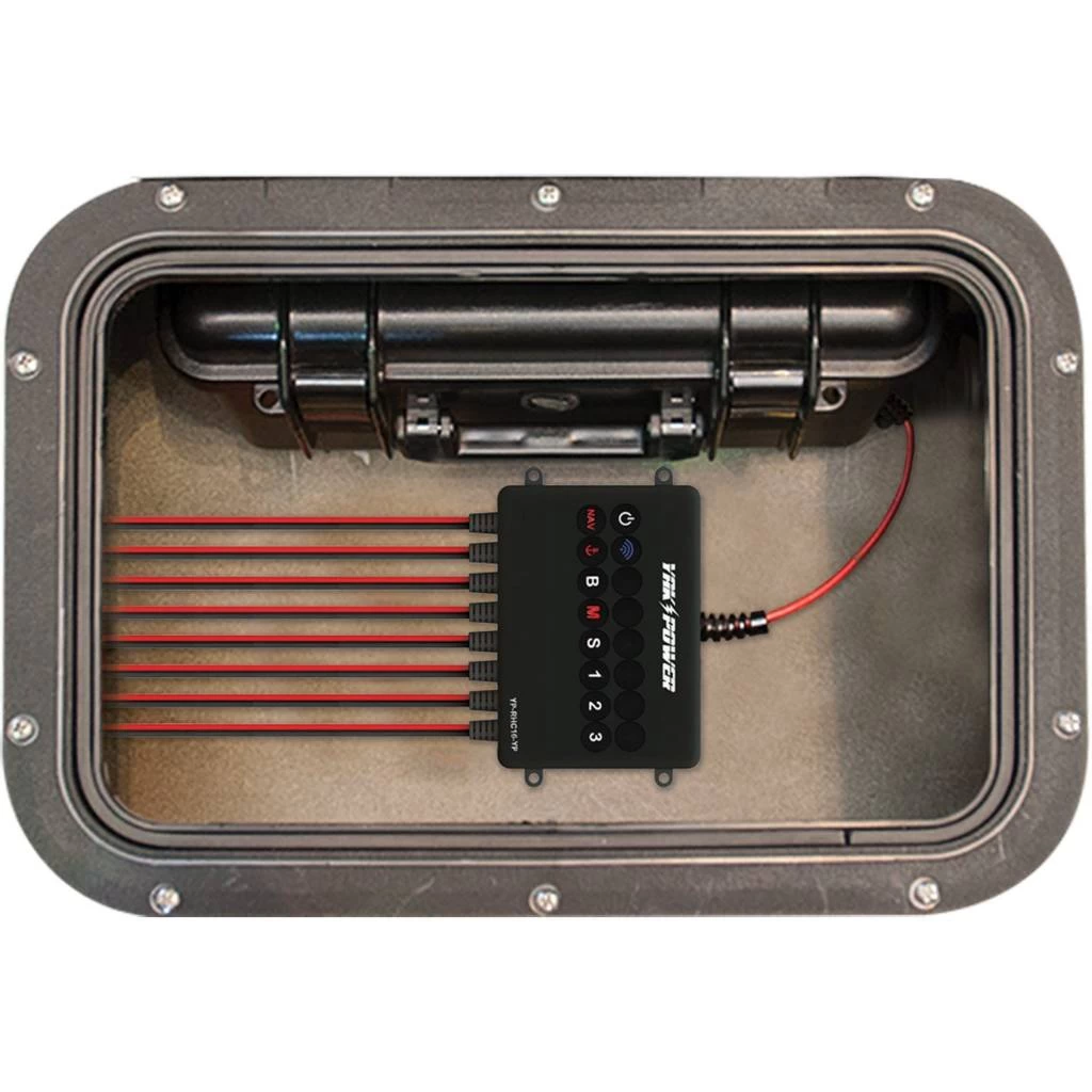 With eight total circuits, NAV, anchor, bow, midship, stern, and accessory 1-3 button functionality, along with integrated Bluetooth and a mobile app, full control of your 12- volt power and electronics will always be at your fingertips. Spend less time rigging and more time fishing.